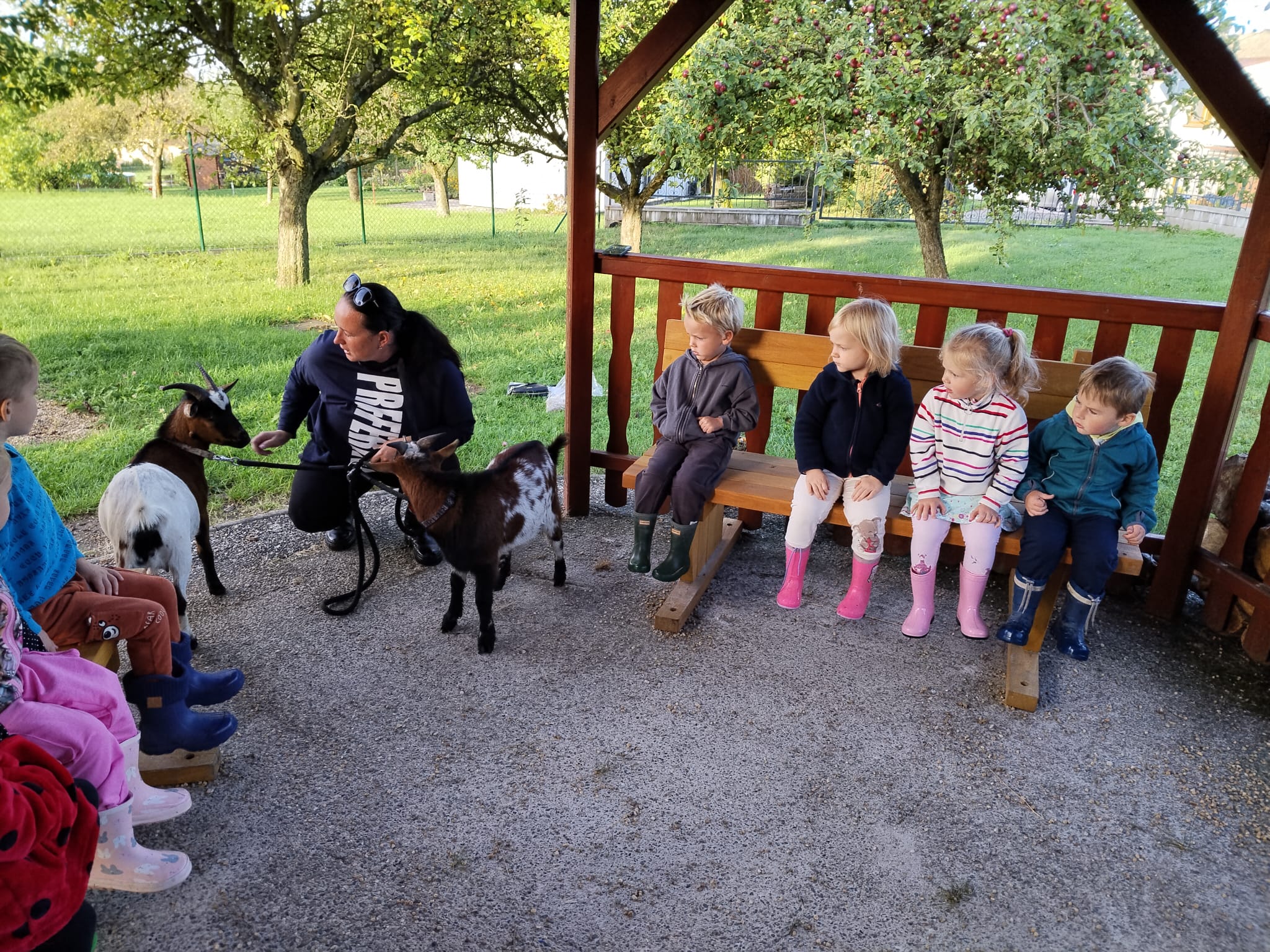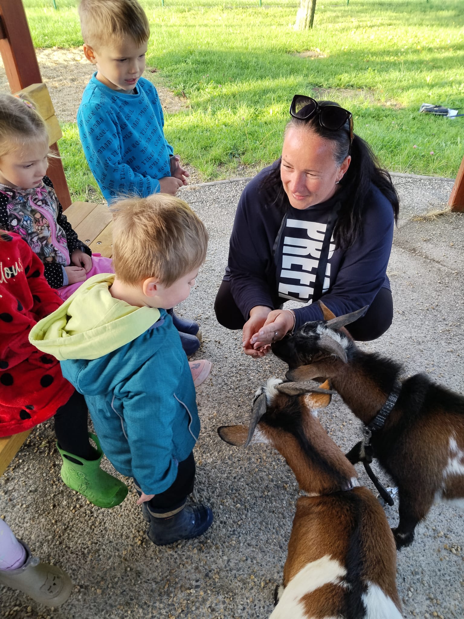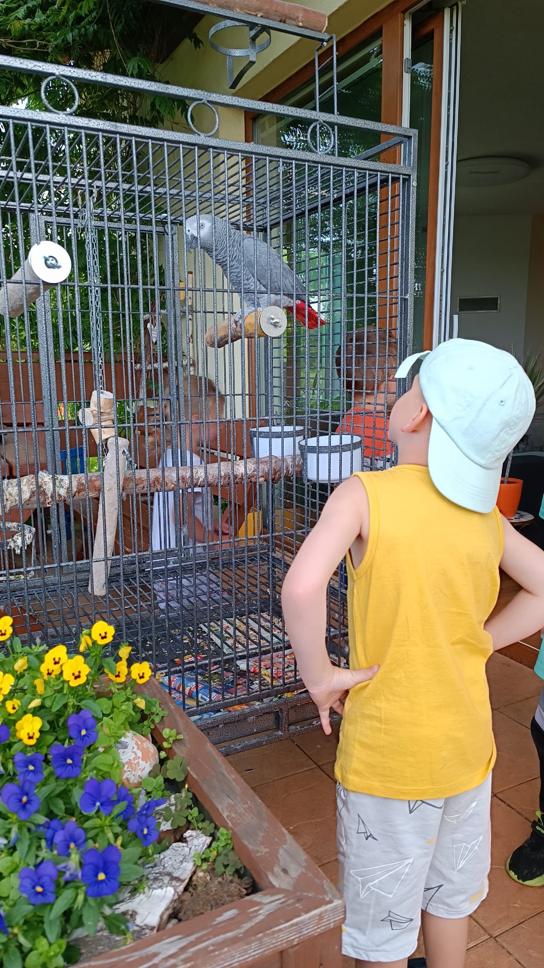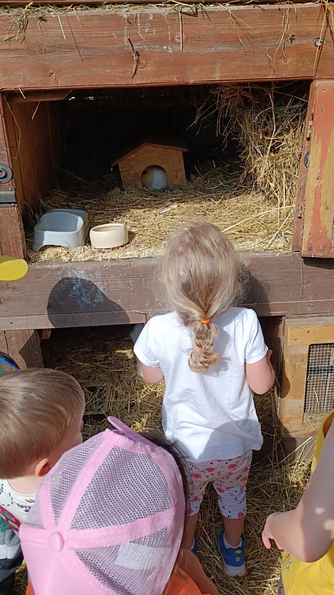 Další výlet byl jen o vesnici dál. K naší Eví do Tatobit, protože má doma mini zoo. Slepice, kachny, husy, králíky, psa, kočku, jezírko plné ryb, a hlavně papoušky. A mluví!