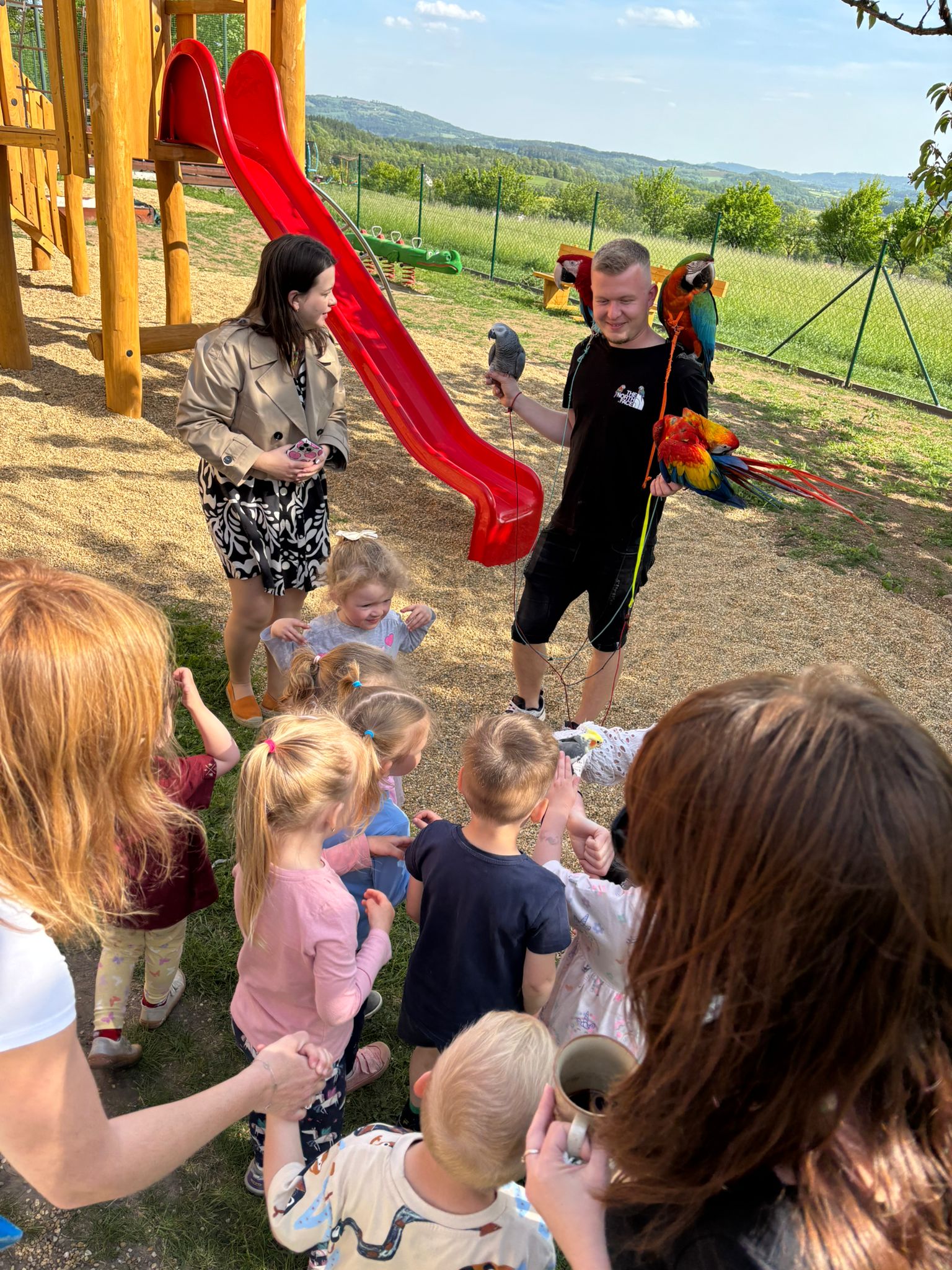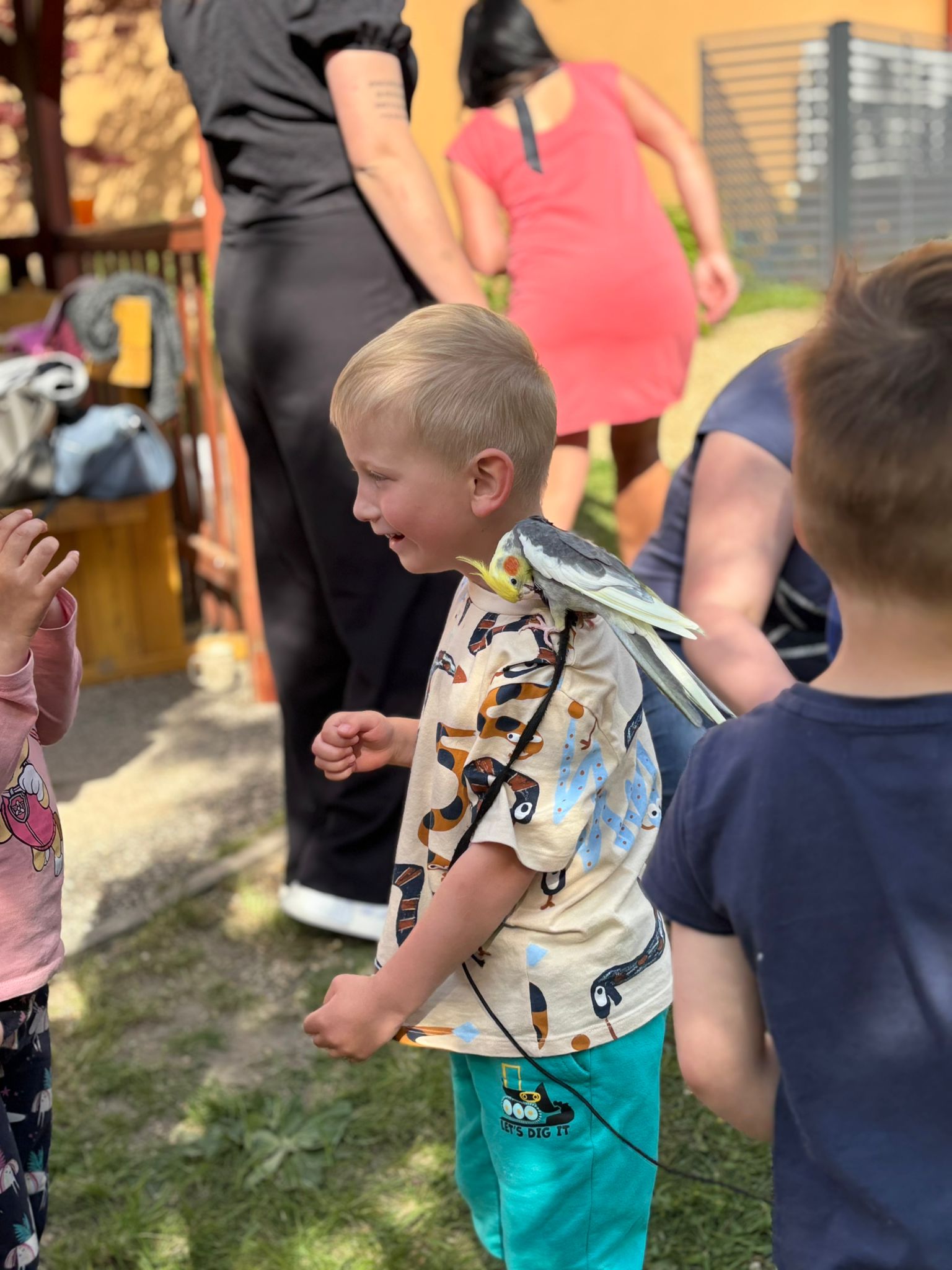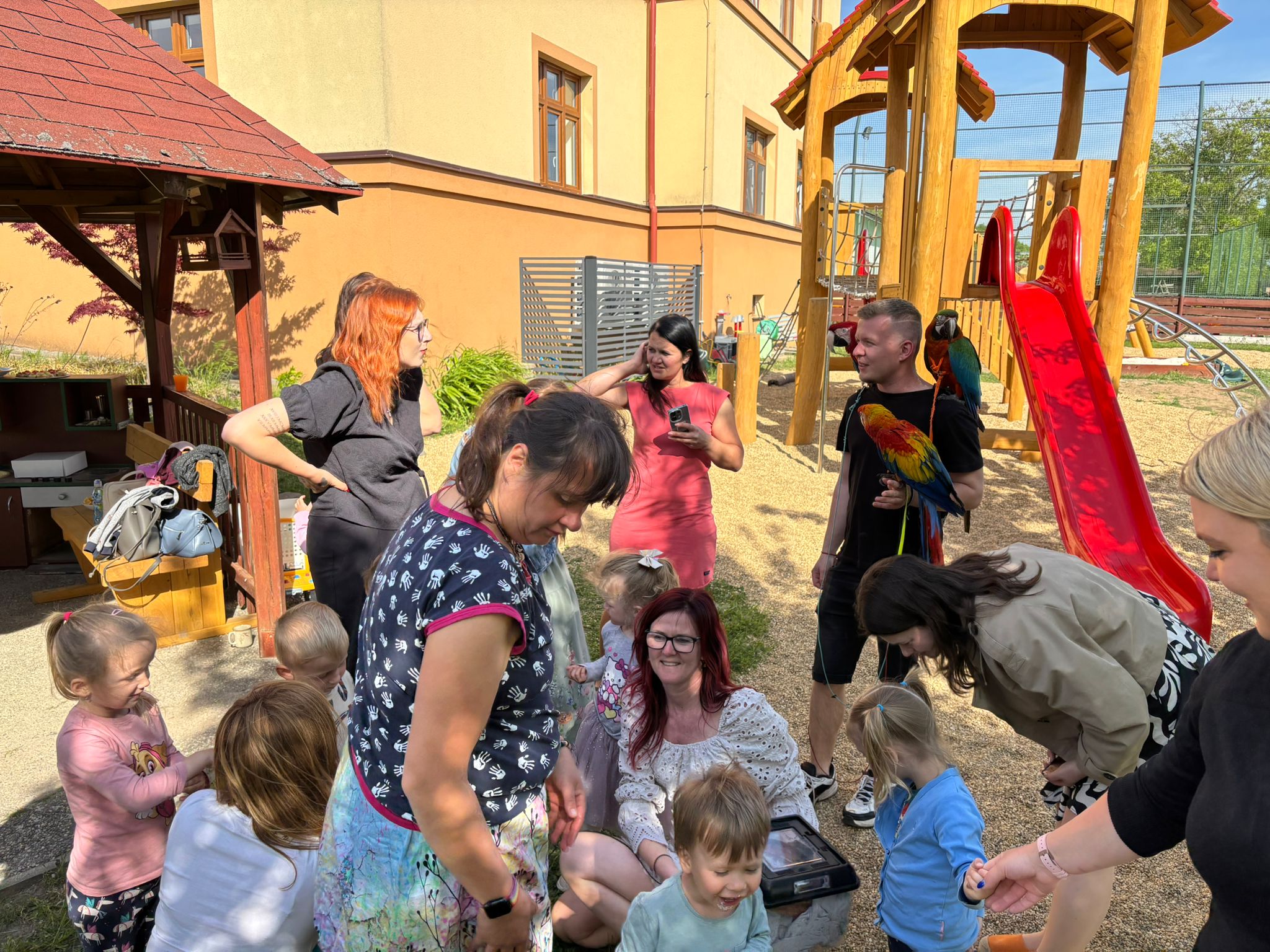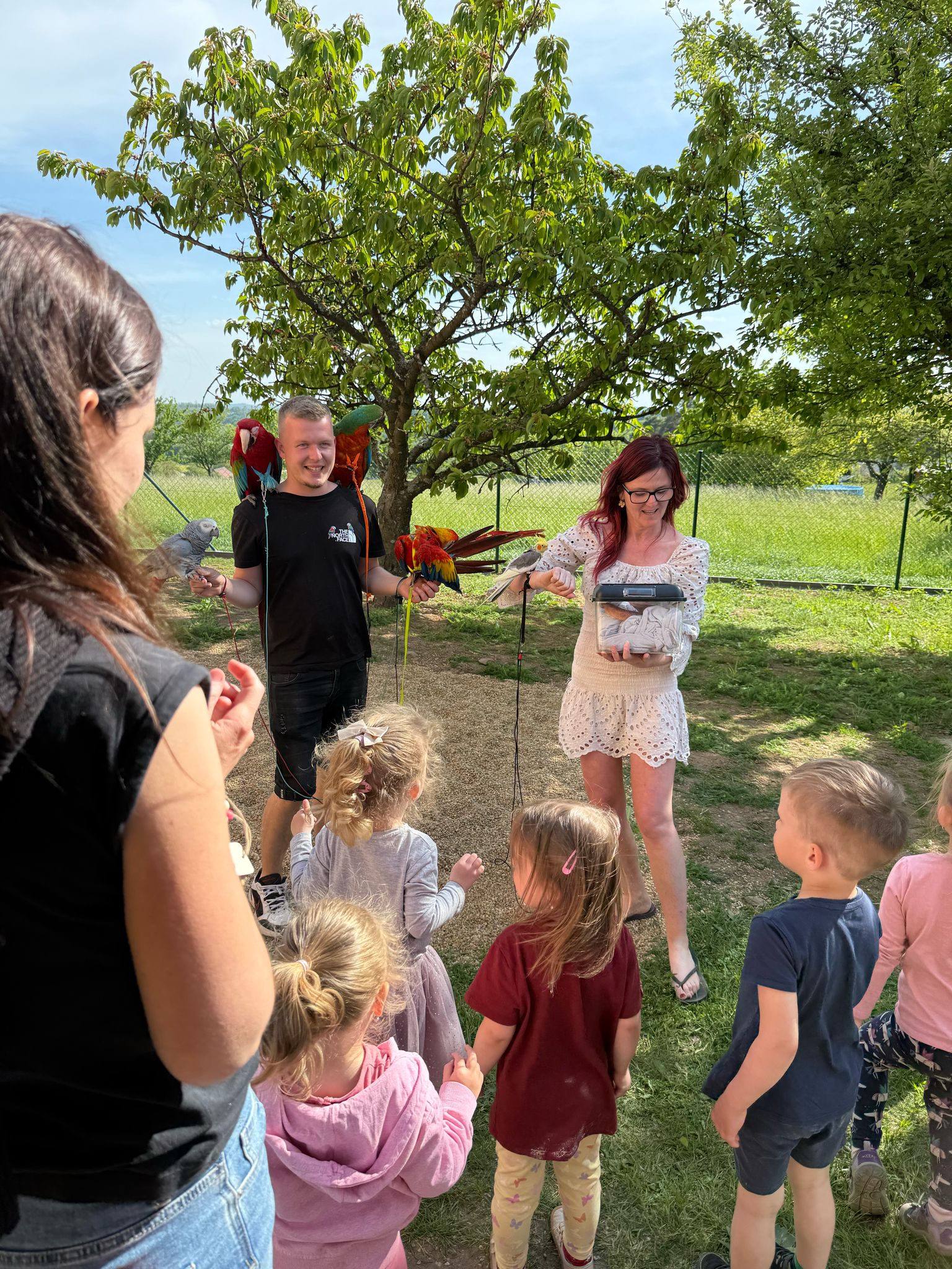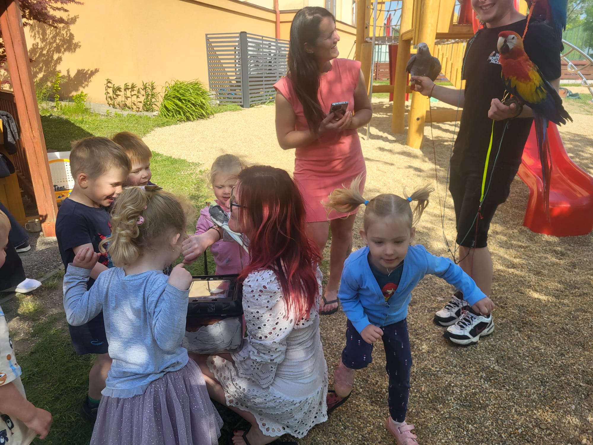 Květen- lásky čas… A největší lásky těch nejmenších jsou maminky! Starostlivé, pečující, laskavé a někdy zaslouženě unavené… A proto jim patří velké dík a zaslouží si občas nějaké to rozmazlení… Tak jsme jim společně s dětmi udělaly krásné odpoledne na zahradě, kde si ve stínu stromů mohly v klidu vypít kávu, dát si něco dobrého a se sklenkou vychlazeného prosseca si popovídat s ostatními maminkami o těch svých pokladech… 😊 Překvapení nejen pro děti byla ukázka papoušků se známým chovatelem Spajkerino (Patrikem Jírou).