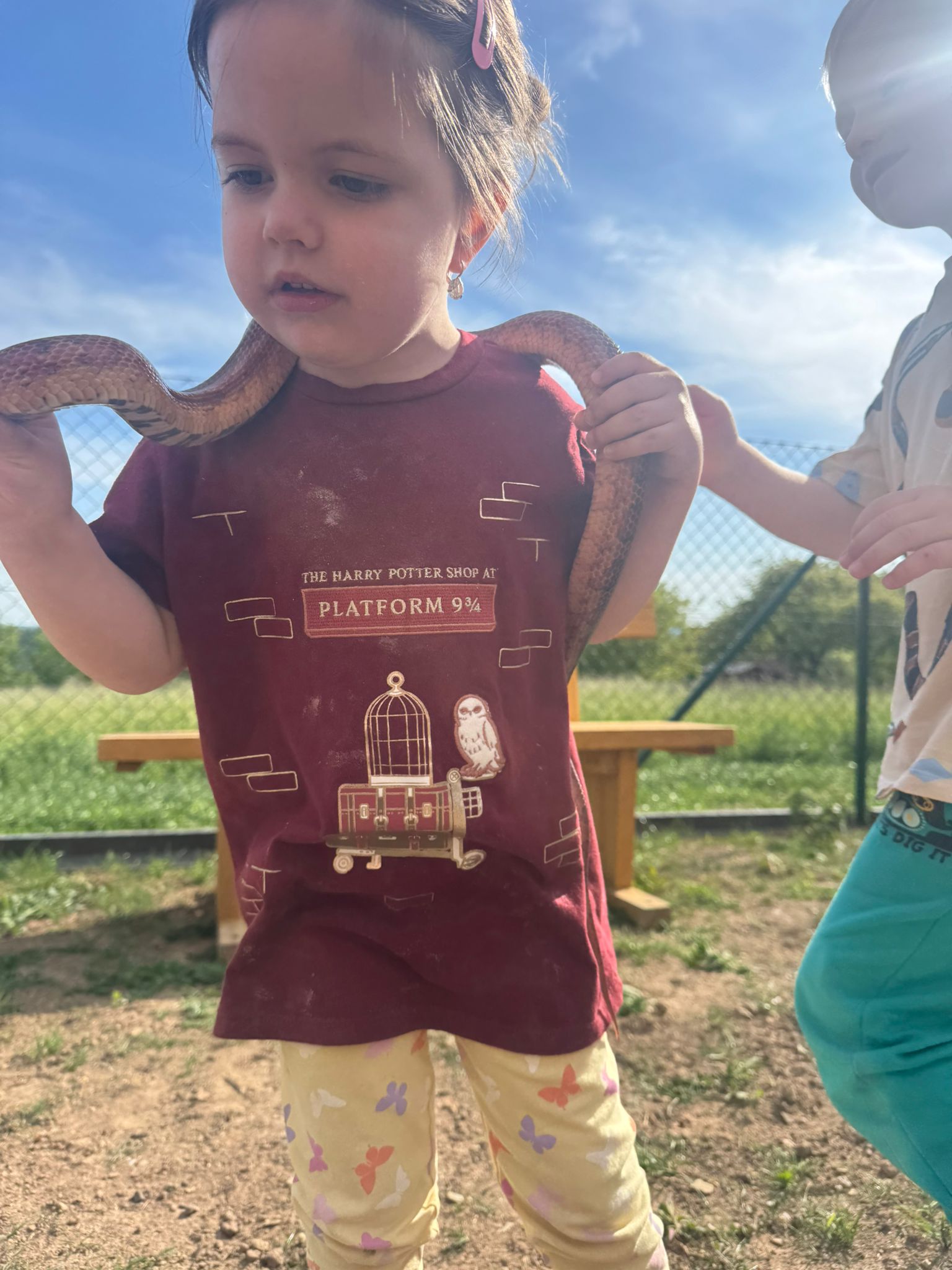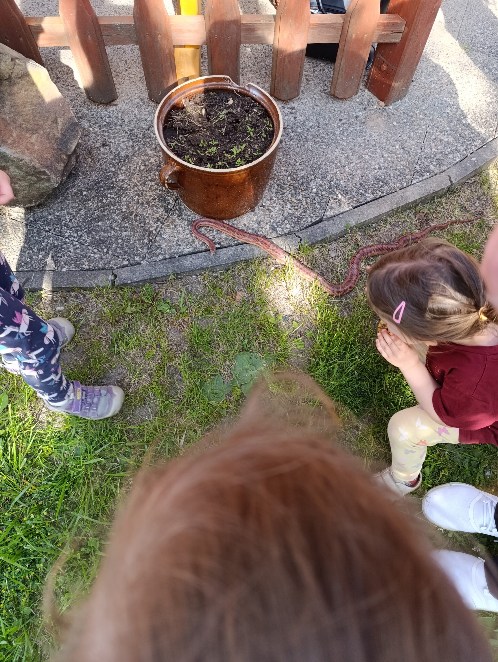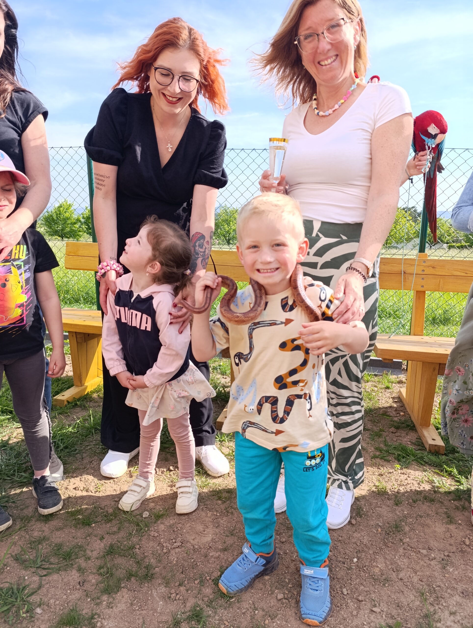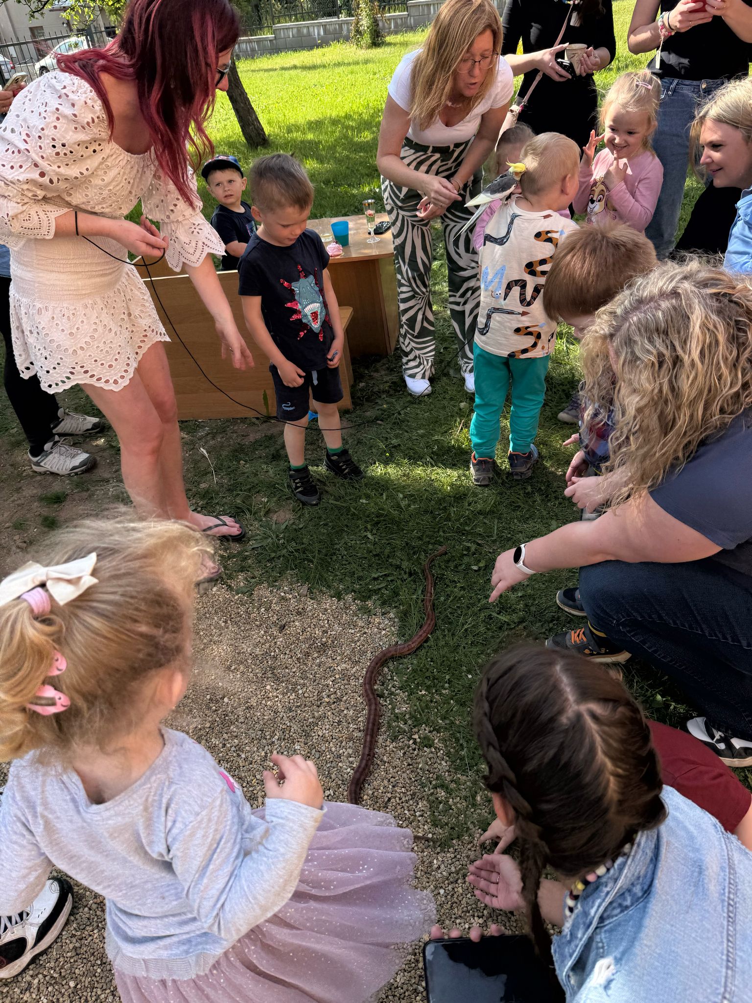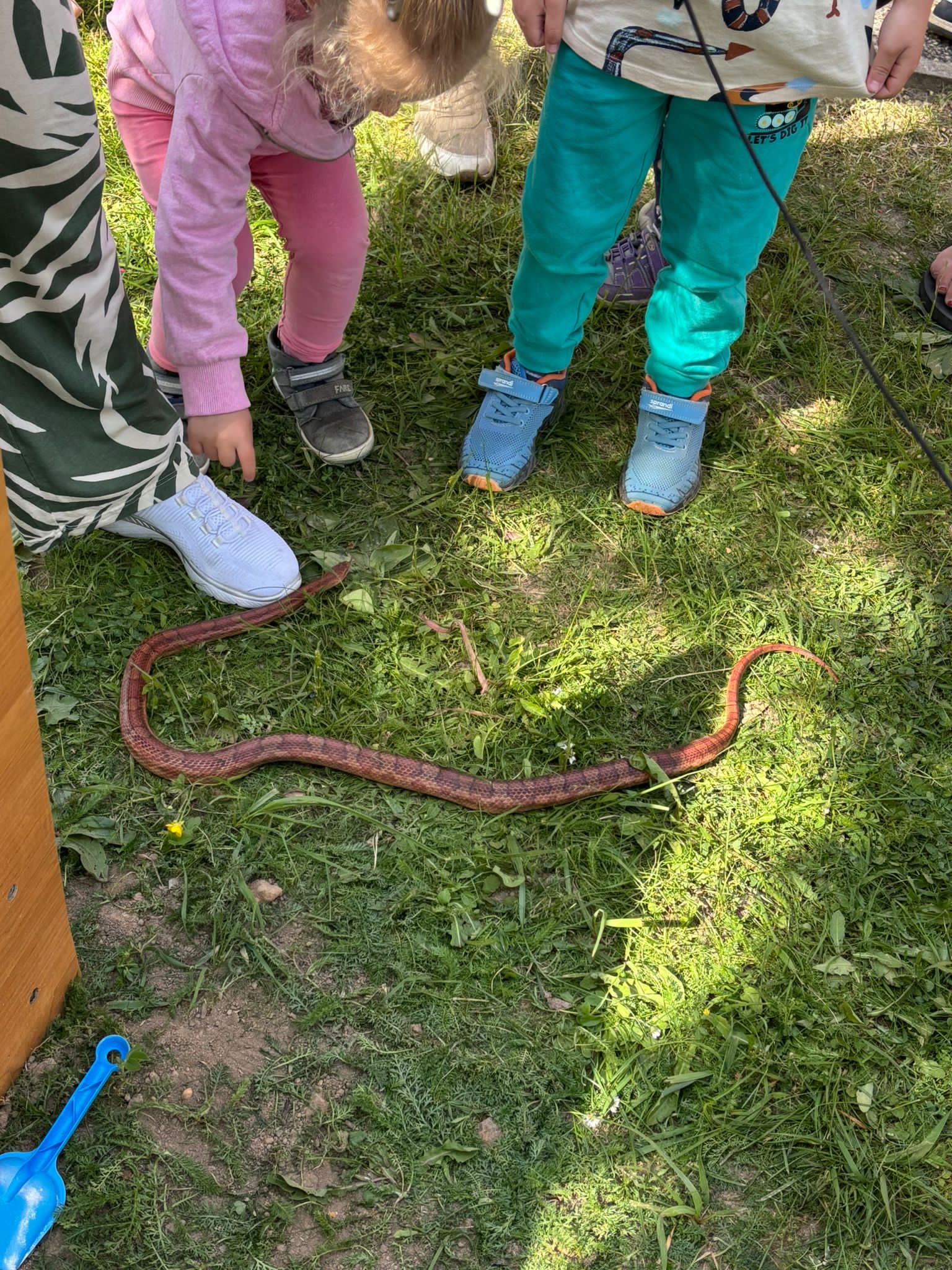 Na svatého Jiří vylézají hadi a štíři… V přírodě potkat hada to není jen tak, ale za námi přijeli až do školky. Děkujeme Dominikovi za neskutečný zážitek. Protože kdo může říct, že na vlastní oči viděl 3,5m dlouhou krajtu tmavou, hroznýše duhového, korálovku kalifornskou nebo se pomazlit s krajtou královskou… 😊